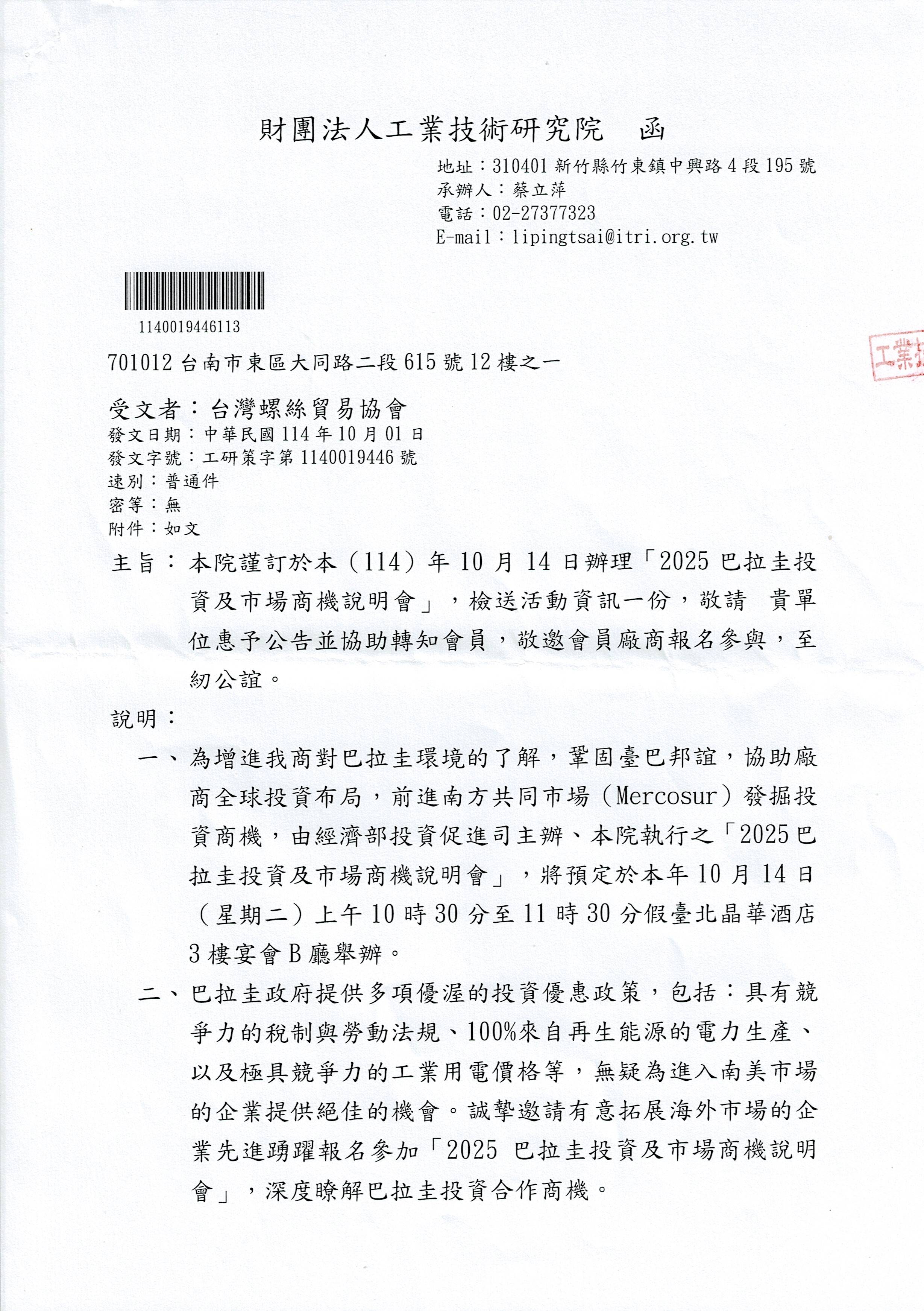 【TFTA轉發通知】:工研院-2025巴拉圭投資及市場商機說明會